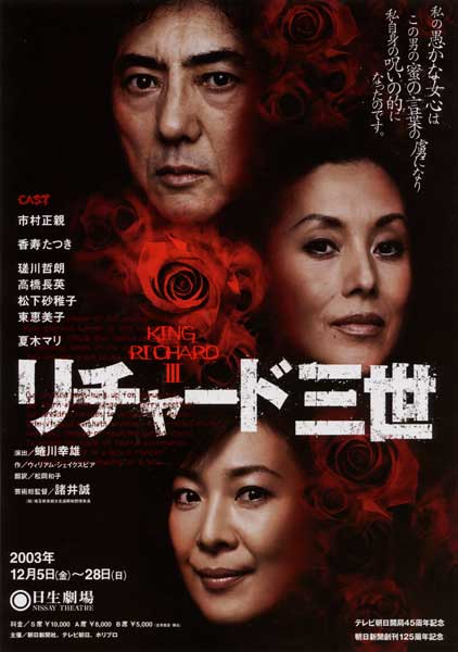 何といっても市村正親が圧巻である。ジョーゼットのマントを羽織り軽やかでセクシーなリチャード三世は、疎まれたこぶ男というキャラクターを越え、人間の欲望を掬い取って観客の共感を獲得するまでに至っていた。もはやシェークスピア劇の域を超え、観客の心を手玉に取る市村正親は本物のアーティストだ。市村正親を得て、この作品はより普遍性を持ち得ることとなった。特に、1幕の終盤、王に推され1人になったリチャード三世が、隠れ蓑で携えていた聖書を放り投げニヤッと笑みを浮かべ成功への階段を昇っていくシーンなどは、悪の美しさの打ち震えてしまう程、格好良い。