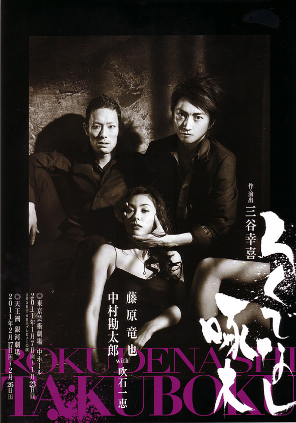 役者もイキのいい御仁が揃った。本作は、藤原竜也が、三谷幸喜への作品制作を懇願したのがきっかけとなった6年越しの企画だということだが、結果、3人芝居にしたという三谷幸喜の判断に、役者発信の企画への返歌が見て取れる。氏は、とことん役者の力を出し尽くすために、敢えて登場人物を限定したのではないだろうか。共演は盟友・中村勘太郎に、「新撰組!」でも共演していた吹石一恵。気心も知れた若手実力派の競演は、緻密に構築された戯曲世界に、ハチャメチャにパワーを全開させて対峙することで、生き生きとした人物像を立ち上らせていく。