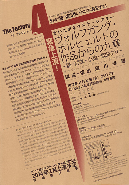 会場内に入ると、約20人程のメンバーが床に転がり、各人にはそれぞれに明かりが注がれている。美しい。そして、俳優陣が、ヴォルフガング・ボルヒェルトが描いた詩作の言葉を、其処此処で順繰りに語り始める。自分がここに生きているという事実を冷静に考察しながらも、自らが存在している在り様の不確かな曖昧さを吐き出すという、アンビバレンツな感情が綯い交ぜになり思わず各人の姿から目が逸らせなくなっていく。