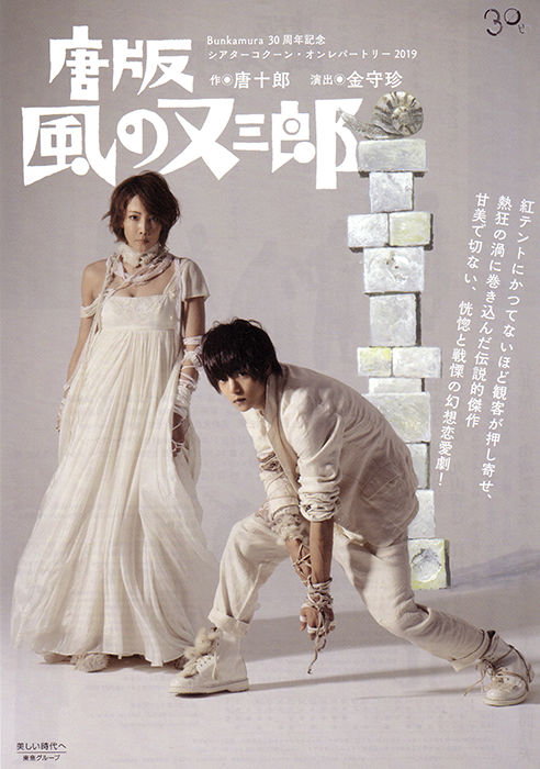 風の又三郎」。1974年に状況劇場公演で初演された作品である。代々木月光町にふらりと迷い込んだ窪田正孝演じる織部の前に、柚希礼音演じる少年が舞い降りてくる。織部は少年を自らが憧憬する「風の又三郎」に出会えたと嬉々とする。
