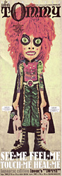 | 場 : 会場に入ると、舞台奥の紗幕に、TOMMYの大きな文字が電飾で明滅している。開演前の携帯電話を切ってねのアナウンスは、その紗幕にアニメが映し出され、可愛いらしくインフォメーションする。 |