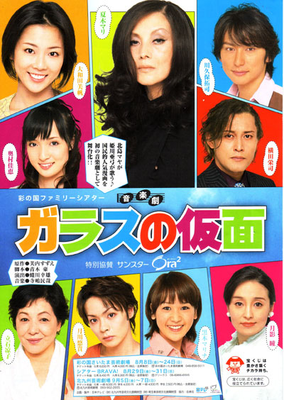 | 人 : ほぼ満席。彩の国ファミリーシアターと謳っているだけあって、小学生中学年位の子どももお母さんと一緒に来ていたりする。終演時間が9時30分位になるのに大丈夫なのかなあ、とか思ってしまう。あと、「ガラスの仮面」ファン、なのかな。幕間には、原作と舞台との違いや比較を語り合っているグループもいる。 |
